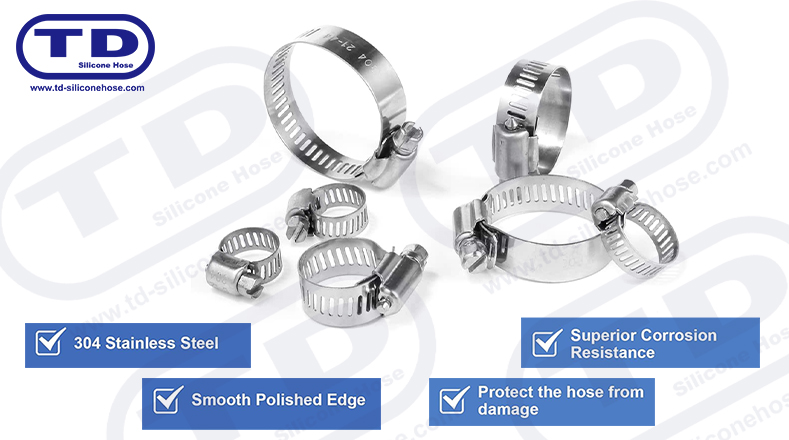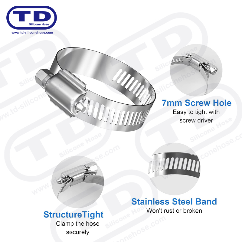 1. Materiálová kompatibilita: Materiál svorky silikonové hadice musí být kompatibilní s silikonovou hadicí, aby se zabránilo poškození hadice v důsledku chemických reakcí nebo koroze. Tato kompatibilita zajišťuje, že hadicová svorka nezpůsobuje poškození hadice, čímž se prodlouží životnost hadice.